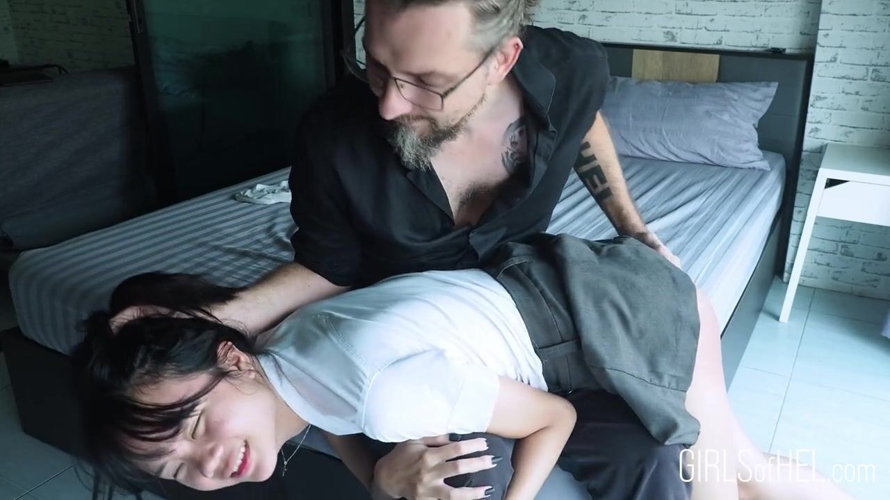 18yo Asian student Baebi Hel gets a private English lesson. She gets a little spanking, then her tight little asian pussy gets filled with a big white cock. After sex she plays with the cum all over her tiny little tits.