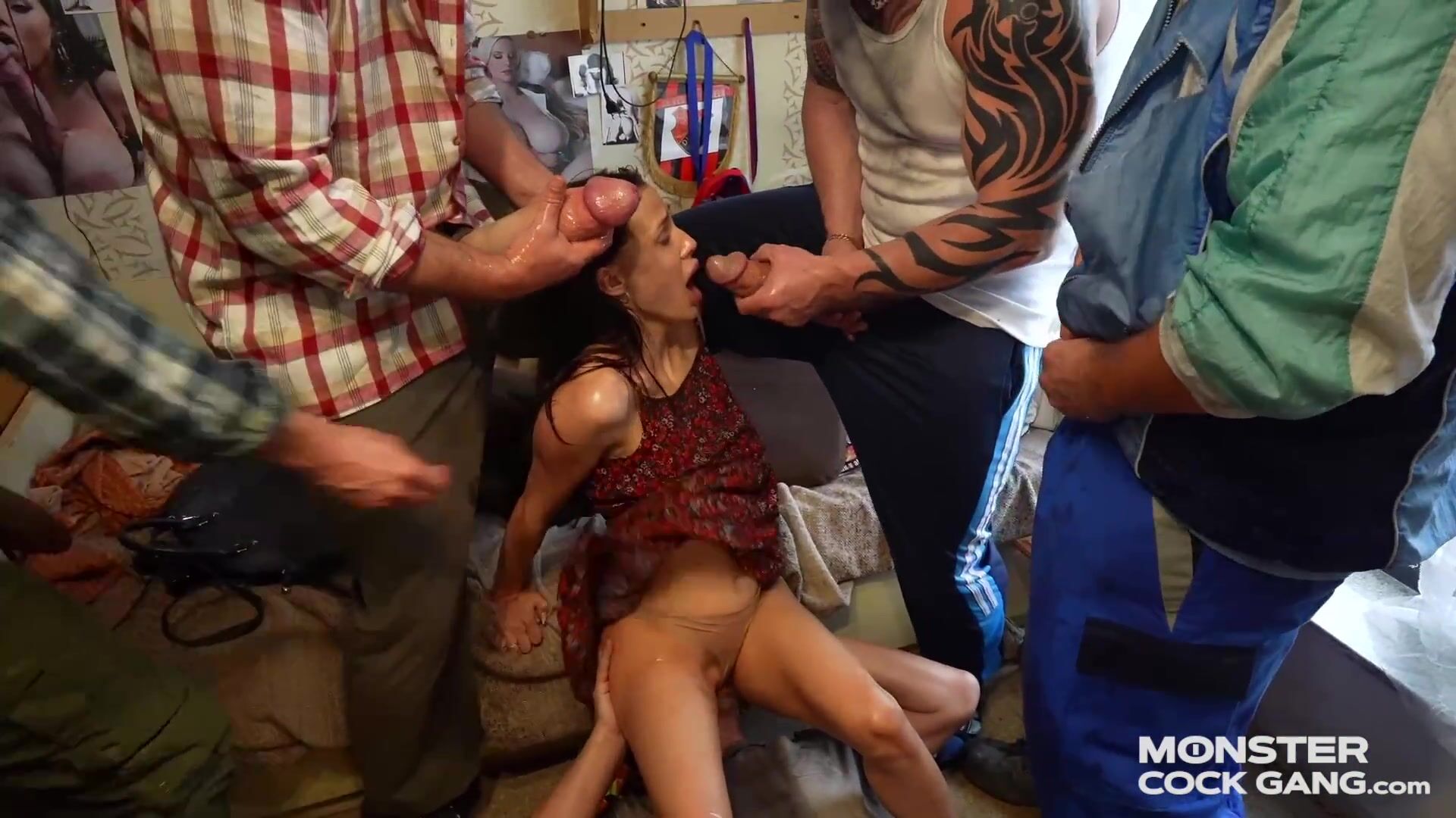 The petite stepdaughter was sent by her stepmother to get her stepfather home. Stepfather's cousins are dirty-minded filthy dicks and want to fuck all the time. It all started with an innocent touch. Full 4K episodes only at: monstercockgang.com
