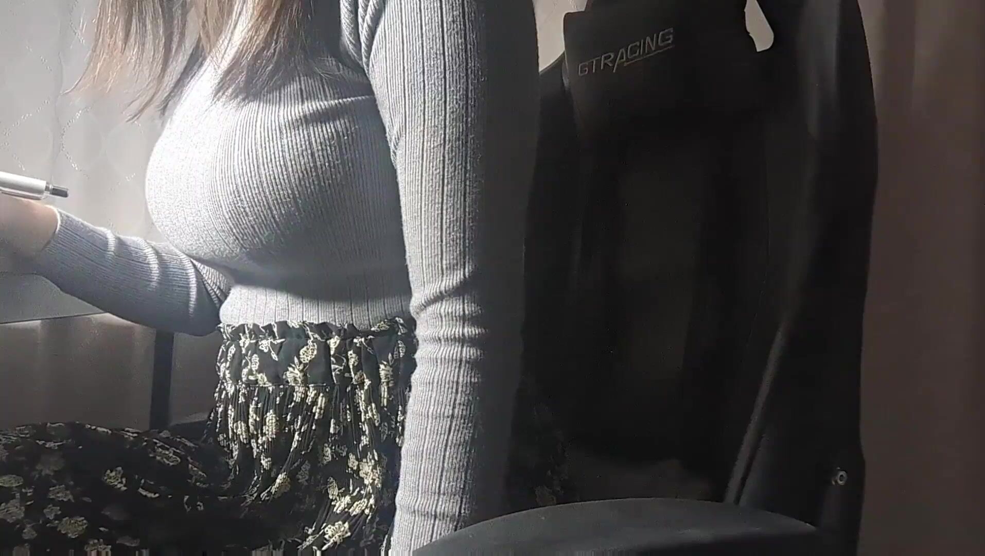 A busty girl gets hot down there while studying and can't help but do something pleasurable